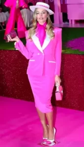 У Сеулі Марго Роббі (кіно про Барбі, головна героїня) з’явилася у яскраво-малиновому діловому костюмі зі спідницею, створеному провідним італійським модним брендом Versace. Образ повністю відтворював елегантне вбрання Барбі-бізнесвумен із 1985 року.